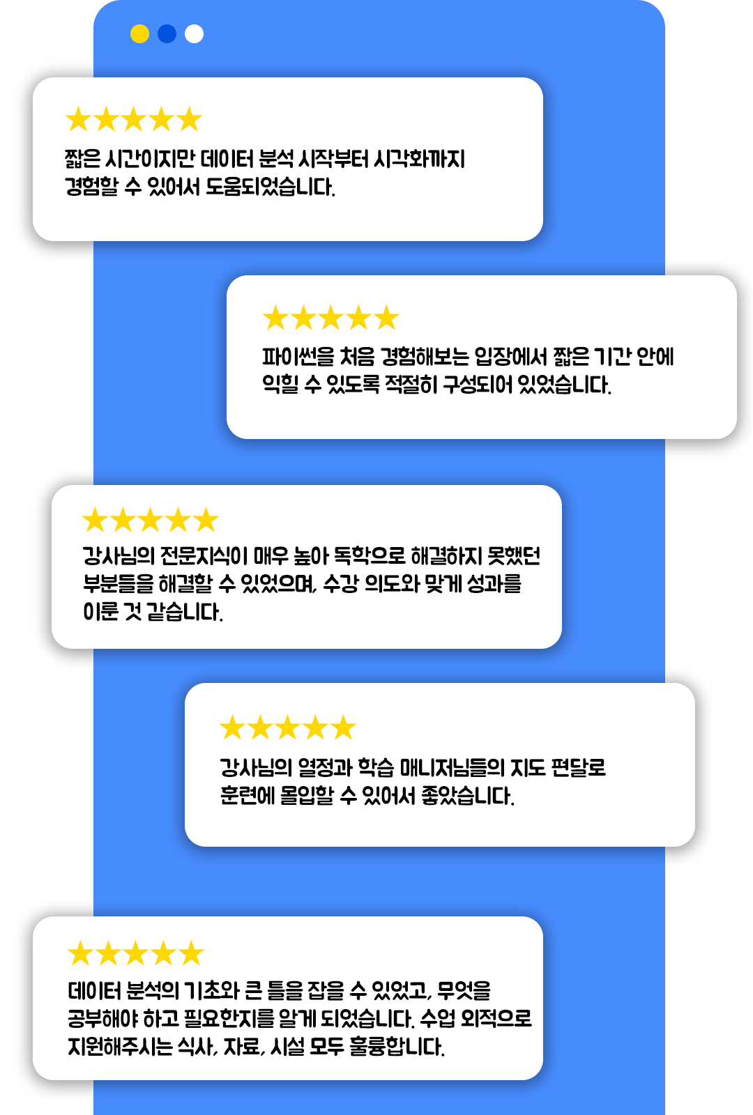 실무 및 강의 경력 확실한 강사님의 빠르고 정확한 피드백으로 확실하게 학습하고